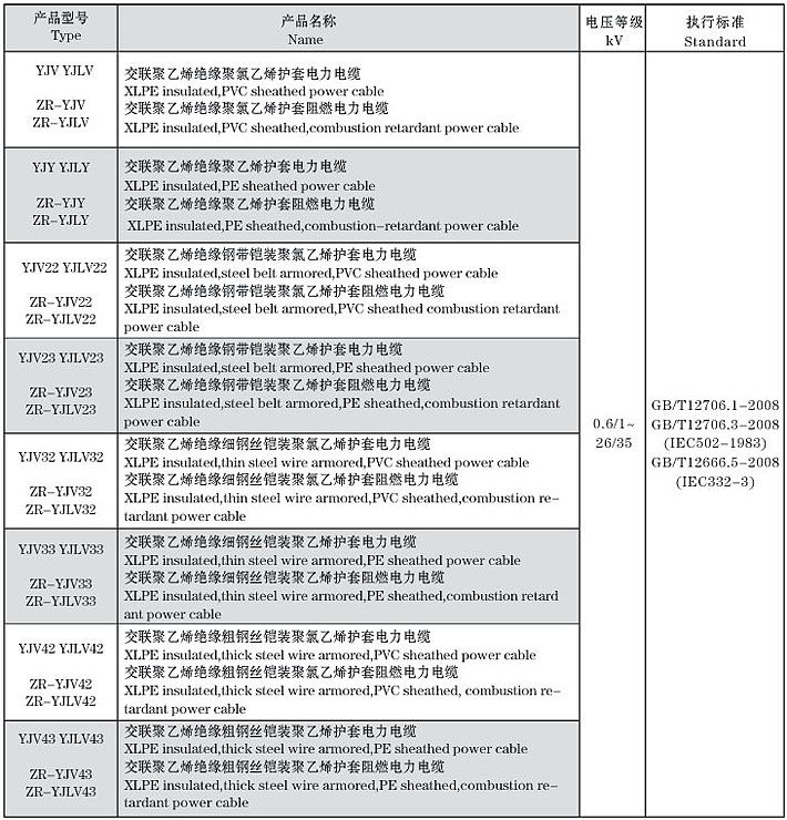 注:可根據(jù)用戶要求生產(chǎn)低煙無鹵、阻燃耐火及耐高溫和耐低溫電纜,阻燃耐火電纜能達到阻燃IA級、耐火I級,符合GB/T19666-2005標準。阻燃電纜在原型號前加"ZR",耐火電纜在原型號前加"NH",低煙無鹵、阻燃耐火電纜在原型號前加"WDZN"。